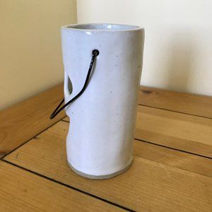 Pottery candle holder has face cut out design on the front, allowing candlelight to shine through. Black wire handle at the top. Pottery has rustic home made look, with imperfections/bumps/speckling to glaze. Bottom has starfish stamp maker mark. Approx. 5.5" tall not including handle x 2 1/2" across top rim. Good pre-owned condition.