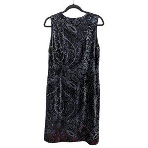 Vintage Sportmax sleeveless velvet dress in a beautiful dark blue, black and silver paisley pattern. The bottom of the dress adds red and bits of purple and dark green for contrast. The deep V neckline features embroidered eyelets to lace up. Fully lined and has a side zipper.