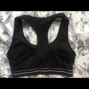 Black and white striped sports bra. Lightly padded, non adjustable. Light support.
