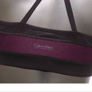 Calvin Klein Performance Sports Bra / Halter Top. A dark wine color with black leather look around upper and regular black banding bottom & sides. Peek-A-Boo cutout hole & adjustable straps . This is in excellent pre-owned condition.