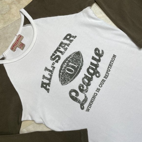 The cutest vintage sporty graphic long sleeve by “Streetwear Society” ☆ Contrast ringer tee style, “All-Star League” graphic, cropped length • Great condition • Size M