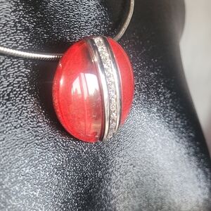 This stunning necklace features a bold red pendant accented with faux diamond detailing. Perfect for adding a touch of elegance to any outfit.
