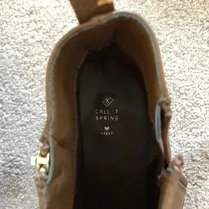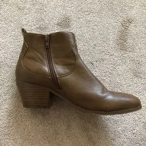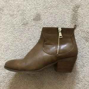 Vegan leather, size 10 ankle booties. Decorative gold zipper on the outside, with functional brown zipper on the inside of the foot.