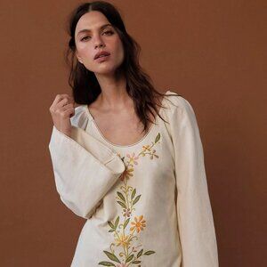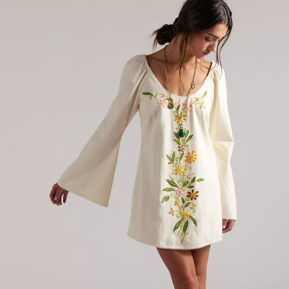 Add this darling number to your dress collection, featured in a mini shift style with a flattering scoop neckline, bell sleeves, and stunning embroidered florals. Color is