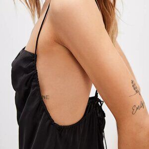 Add the most stylish piece to your slips collection with this stunning mini featured in a silky fabrication and drapey, relaxed fit with straight neckline, dropped waist, and super exposed back for the perfect finishing touch. Color is Black Size M. NEW SPRING 2025!
