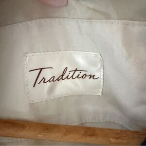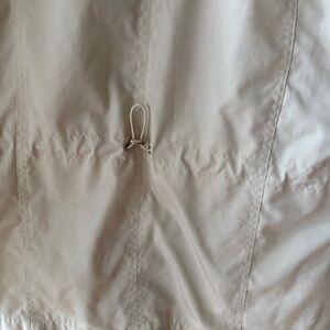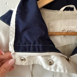 A timeless staple for every wardrobe! This Tradition jacket is a perfect blend of style and practicality. In a versatile beige with contrast navy trim, it features a removable hood, zip + snap button closure, and roomy front pockets. Lightweight yet protective – great for layering through spring, fall, or breezy summer nights.In excellent pre-owned condition.