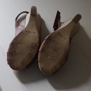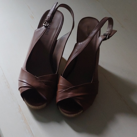 Worn once to a wedding, brown leather and buckle closure, bottoms have a bit of wear but otherwise in great condition