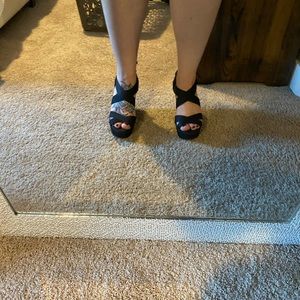 Spring heels in good used condition, have tie at back to hold foot in. I sadly don’t wear them anymore but they are super cute! I can’t find the size on them but they would fit like 8.5-9!
