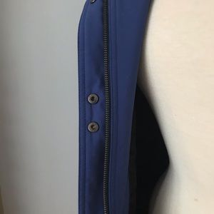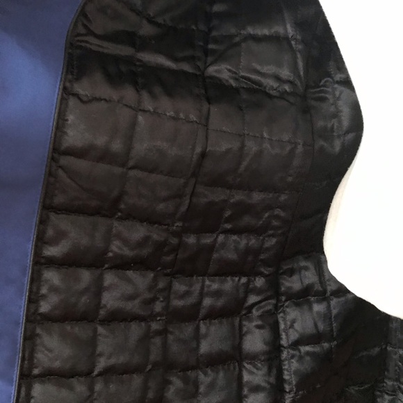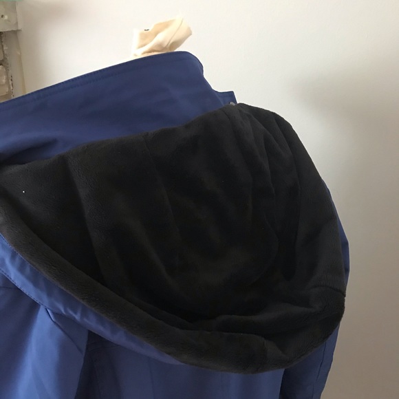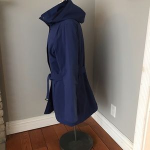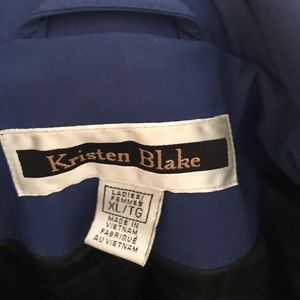 Kristen Blake spring/fall navy jacket. It has a lined hood. Zippered opening with silver snaps as a secondary closure. It has a belted waist tie that can be removed and worn loose. Beautiful black quilting inside the jacket. Side pockets. Kick pleat on the back of the jacket so it is comfortable foe driving. Great condition. No stains, rips or pulls anywhere. Pet and smoke free home!