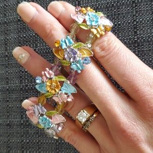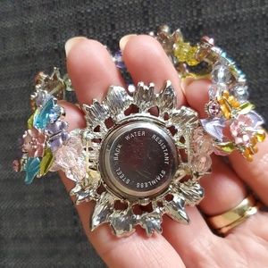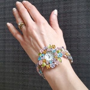 Wristwatch perfect for spring! Pink, purple, blue, orange and green. Metal painted components with crystal accents. Quartz face. Watch does work but needs a new battery. Stretchy band. Perfect condition.