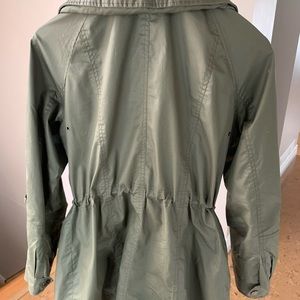 Army green spring jacket in great shape! The zipper is a bit tough but works fine. Longer in the back. Very stylish. You can roll up the sleeve and has a midden hood in case of rain.