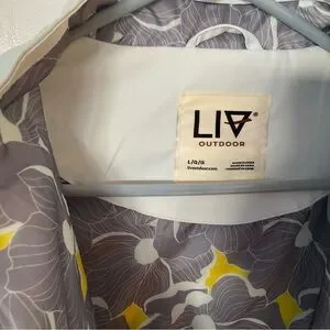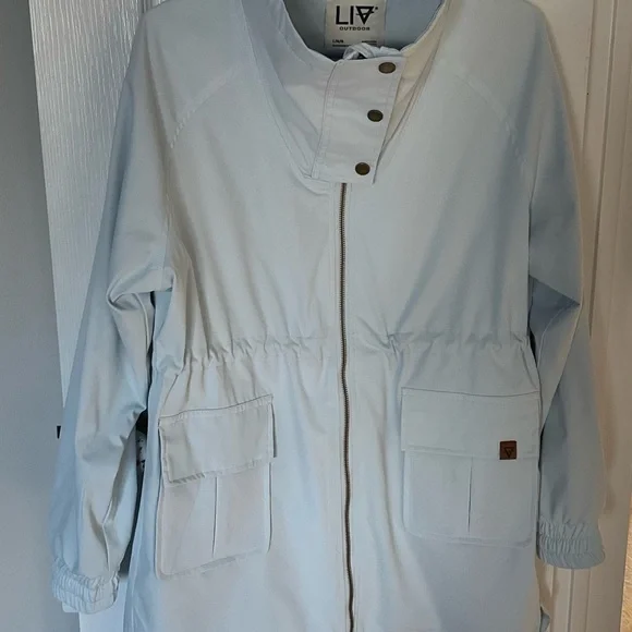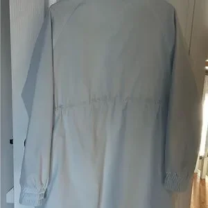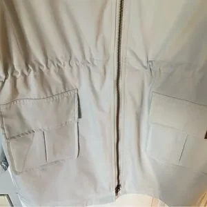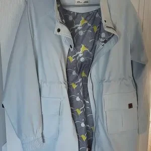 This utility jacket features a light blue color and a relaxed fit, making it perfect for casual wear. Lining is a medium/light blue and yellow floral design. The pit to pit measurements are approx. 44” and 40” at the waist. The drawstring waist allows for a customizable fit, ensuring comfort throughout the day. EUC only worn twice!