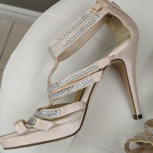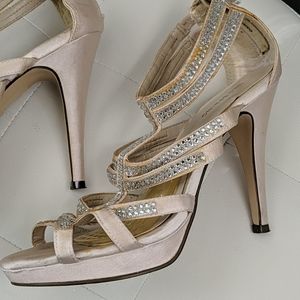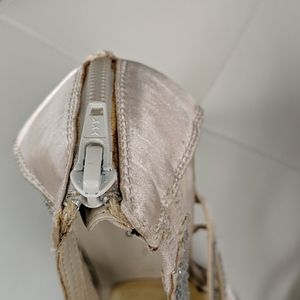 Spring size 8 light pink platform heels with glued silver beading. The beading caused a slight orange staining, which is evident from the pictures. Worn a couple of time. Some wear and tear.