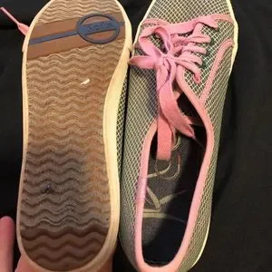 Navy and off white pattern goes with everything and pop of purple is very on tend for spring/summer 2022. Worn only a couple times EUC my feet are just too big after having my son.