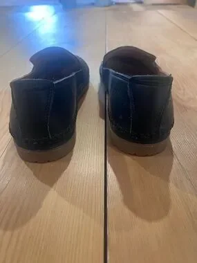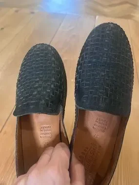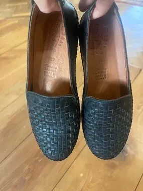 Woven genuine leather upper. Slip-on design for easy wear. Padded insole for comfort. Smooth leather lining. Size 37. I inherited them but they are a size too small for me. Looks like they have never been worn. Very soft leather, heel is also soft so it shouldn’t rub on heel or cause blisters. Navy blue.