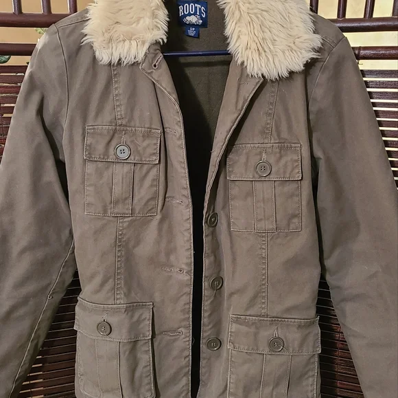 Canvas style fun fur collar jacket. Light lining. Great for fall or spring. Great condition. Seldom worn.