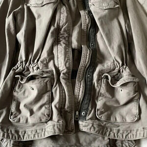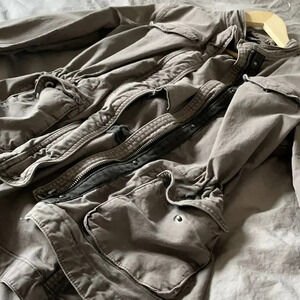Includes pockets throughout, has waist tie which is adjustable on the interior of the jacket.