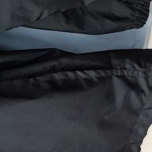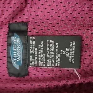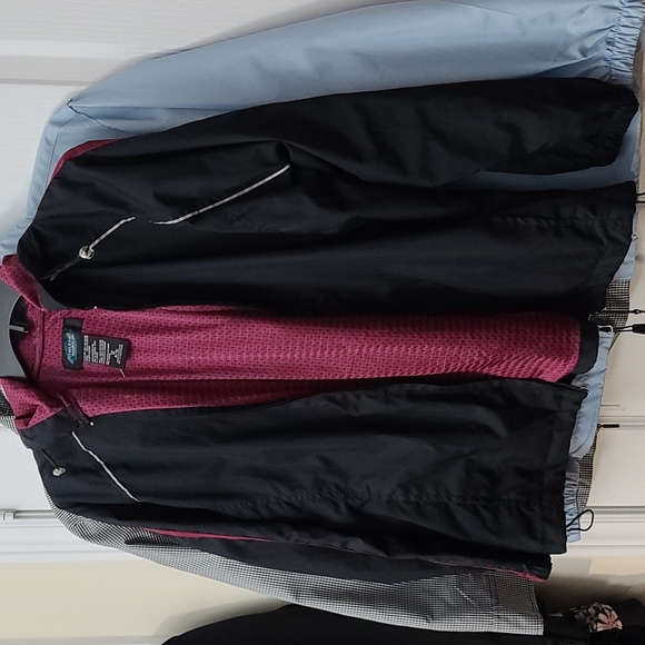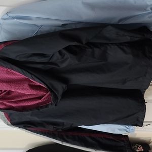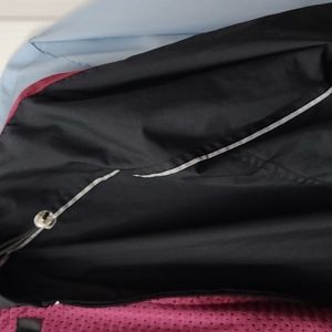 black, maroon stripe, women's rain jacket, spring/fall. includes side pockets, zipper and hood.