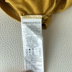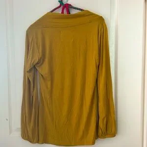 Chic design with faux shawl, deep cut, puffy sleeves, light and soft rayon fabric, size L. Beautiful gold mustard colour. Never worn, thought I was buying S.