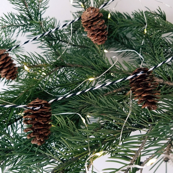 A perfect accent for your tree this Christmas season. These also make beautiful decorations on banisters, walls or down the middle of a table to accent your centerpiece. Each hand tied garland is 58" long and features twelve charming spruce cone on a red and black stripe cotton string.