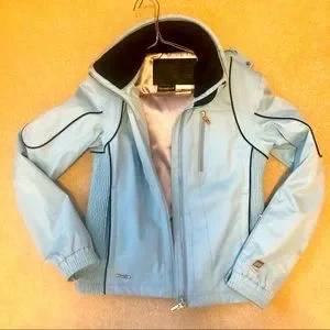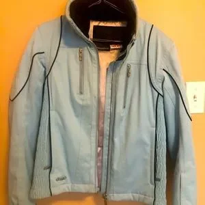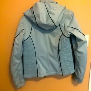 Baby blue ski jacket. Down filled, several pockets , hood. Super warm. Great pre loved condition.