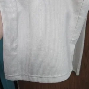 New without tags, no flaws seen. Lovely, ivory, high waisted, ribbed, wide straight leg, pull on pant with elastic waistband and hand pockets. Great loungewear or everyday wear piece. I accidentally tore the material tag off so it is included in the pictures but won't be with the pants. 67% polyester, 26% rayon, 7% spandex.
