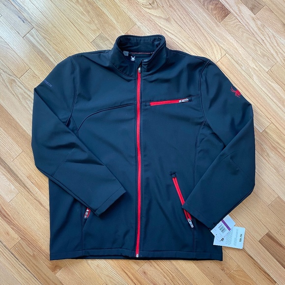 Waterproof softshell jacket with fleece lining by Spyder. Black with red accent zippers. Made with X.tl, which is engineered to provide an incredibly durable coating that is fully waterproof, while also lightweight, breathable and that lends stretch recovery to the fabric. Would be good as a light winter (light snow or rain) jacket or a transitional fall-winter jacket. New with tags.
