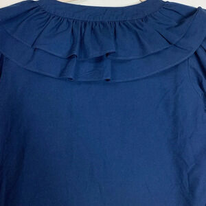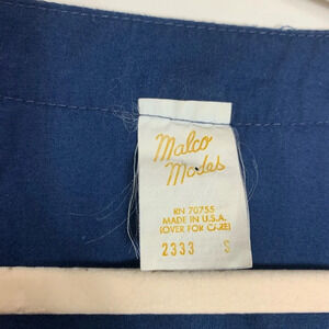 Square Dance Blouse S Ruffle by Malco Modes is a vintage 80's piece perfect for rockabilly swing enthusiasts. Made in the United States, this blue blouse features a solid pattern with ruffle detailing, suitable for women who enjoy square dancing. this piece from Malco Modes is a must-have for any dancewear collection.