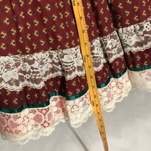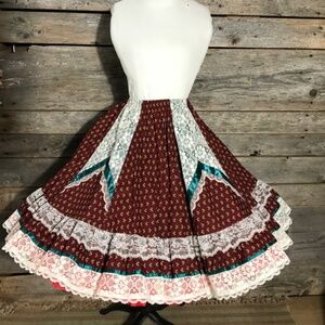 This fun, 100% cotton square dancing skirt is a size Large and designed by Pitchfork Brand. It has a maroon and yellow floral print with lace panels down the front and lace ruffles around the bottom.