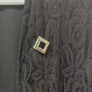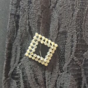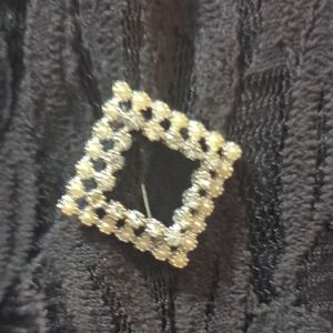 Elegant square brooch covered in clear rhinestones. Sparkling finish. Secure pin back. Great for dresses, scarves, or jackets.