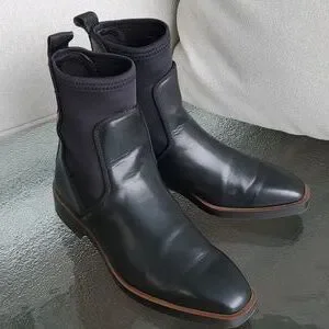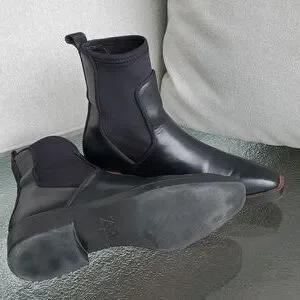 Pre-loved booties with neoprene at the top. Stylish square toe with brown around the edges. Worn a handful of times. There are a few small scuffs on the heel, open to offers! Measurement from base of the bootie (above the heel) is 6.5 inches. Unfortunately I do not have the box.