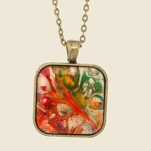 Handmade orange, green & gold fluid art pendant with a square design set in a brinze-tone bezel with matching 18 inch necklace. Perfect gift or statement accessory.