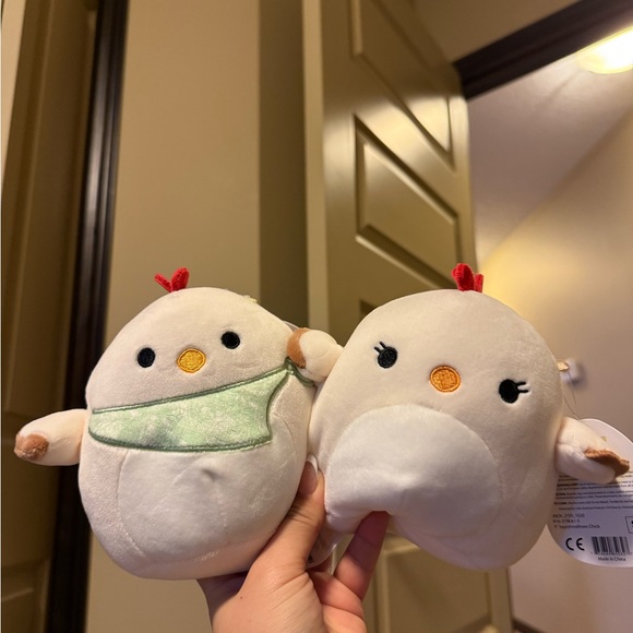 Adorable plush chicken toy set in cream with red accents. Perfect for small pets to cuddle and play with.