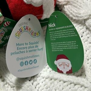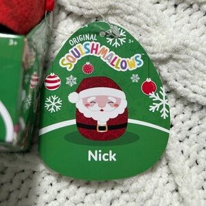 Nick is none other than Father Christmas! He has a large round nose, a scruffy white beard and eyebrows, and he has black smiling eyes. He wears a classic red Santa outfit, including a cap and jacket with white trims and black belt with a gold buckle. New with tags! 5 in. Super soft and adorable!