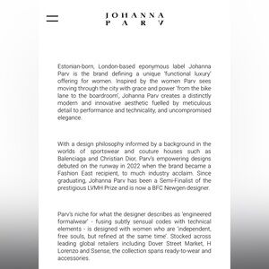 Johanna Parv is the brand defining a unique 'functional luxury offering for women. Inspired by the women Parv sees moving through the city with grace and power 'from the bike lane to the boardroom, Johanna Parv creates a distinctly modern and innovative aesthetic fuelled by meticulous detail to performance and technicality, and uncompromised elegance.