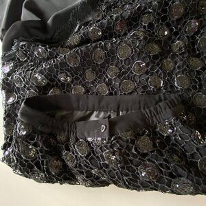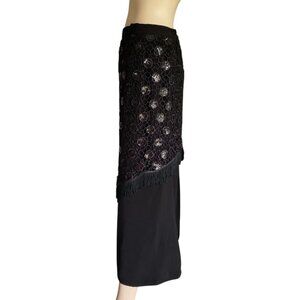 Sz 8 Turn Heads with this stunning St Anthony Sacari limited production statement Midi Crochet Sequin Overlay Skirt. Features floral Sequin embellished crochet overlay with an asymmetrical cut and fringe trim...a perfect mix of sophistication and drama. Hidden back side zipper & button closure, slightly elasticized waist sides, fully lined. Pair with silk blouse or fitted top & heels for evening wear, partys and & formal occasions. Measurements: Waist:14", Stretches to 15" comfortably, Length: 35". In Excellent preowned condition.