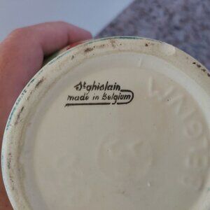 This is a vintage Art Deco pitcher or ewer made in Belgium by the Faïencerie de Saint-Ghislain (St Ghislain earthenware factory).