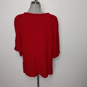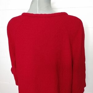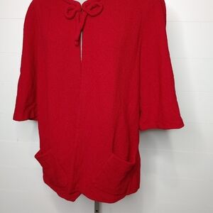 Dark red (most similar to 'burgundy' in shades chart) knit jacket style cardigan with adorable bow detail and one metal hook and eye closure at neckline. Cropped sleeves. Great layering piece! Perfect for holiday parties. One very minor flaw: a small hole has been repaired in the back. Not noticeable. In otherwise excellent condition. No material tag. No size tag. Can fit XS to L easily.