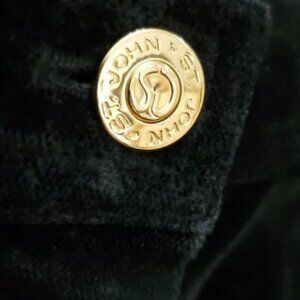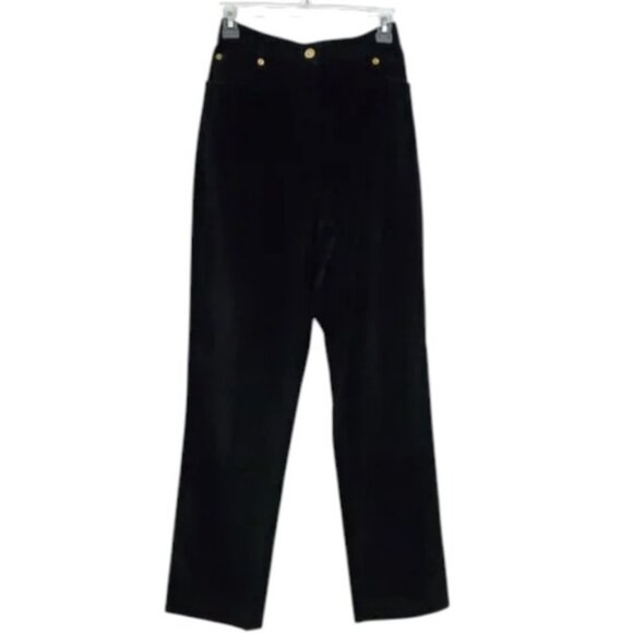 A pair of black velvet pants by St. John Sport. These pants feature a high-waist with a straight-leg cut and gold-tone button details at the waistband. These pants are made from a blend of cotton, rayon, and spandex, offering a warm and comfortable fit. St. John is a luxury American fashion brand known for its knitwear and classic designs.