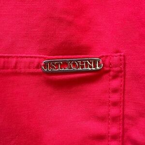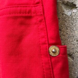 Elevate your wardrobe with these St. John Red Straight Leg Jeans finished with gold rivets and branding on back pocket.