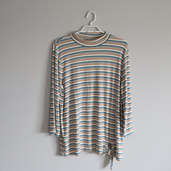St. John's Bay Women's Sz XL Tan Striped Tie Front Mock Neck Ribbed Pullover Top
