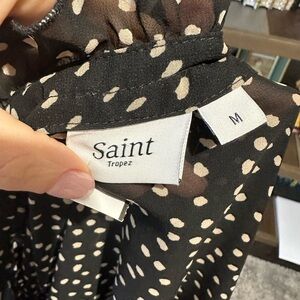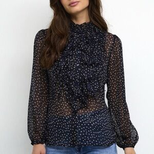 Add a statement piece to your wardrobe with this Saint Tropez sheer ruffle blouse in a timeless black and ivory polka dot print. This lightweight, long sleeve blouse features romantic ruffle details down the front and a vintage-inspired high neckline, blending elegance with modern versatility.