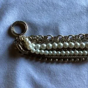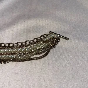Bracelet with a lot of chains. One row of pearls one little diamond one and 3 gold in different designs