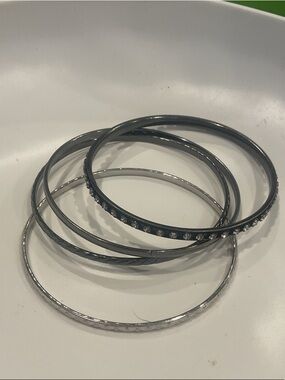 Elegant stackable bangle set in polished silver tone. Lightweight design for comfortable all-day wear. Versatile styling for casual or dressy outfits. Includes mixed textures for added visual interest. Silver color complements any wardrobe.