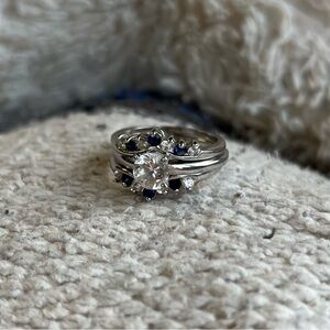 stackable silver tone 3 ring set with blue and clear stones. Don’t know anything about it or if the stones are real, each ring is marked with a “D”