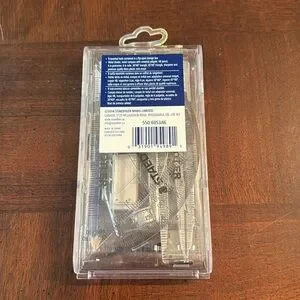 Contains: metal divider, metal compass with universal adapter, Mars plastic mini eraser, HB pencil, 6" protractor, 6" ruler, 30/60 triangle, 45/90 triangle, sharpener and storage case