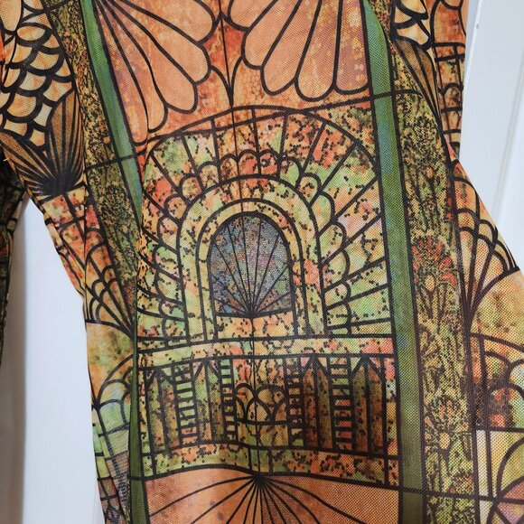 Sheer mesh Delia's top with a mostly orange and green hued stained glass print. Long-sleeved, mock neck.