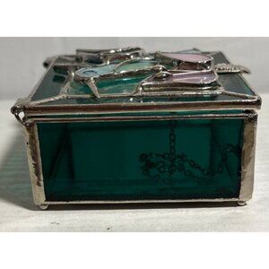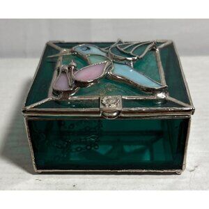 Stained Glass Trinket Box Hummingbird & Flower Hinged Green Blue Pink 3" Mirror