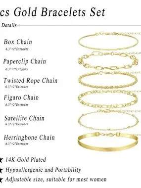 6PCS GOLD BRACELETS SET: The bracelets set comes with 6 bracelets of different styles, Figaro Chain, PaperClip Chain, Herringbone Chain, Twisted Rope Chain, Satellite Chain, Box Chain. By mixing and matching different designs, you can create a unique style to meet your various occasions and wearing needs, making you more trendy and charming