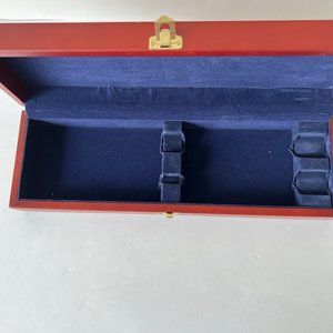 This Hampton @ Home Stainless Steel Carving Knife and Fork Set comes beautifully presented in a rich red cherry-finished wooden box. The interior is lined with blue velvet, tailored to securely hold the set. The box features a brass-colored clasp and matching accent hinges. It also includes four felt feet on the bottom to protect surfaces from scratches. This stunning set is perfect for serving during the holiday season or any get together.
